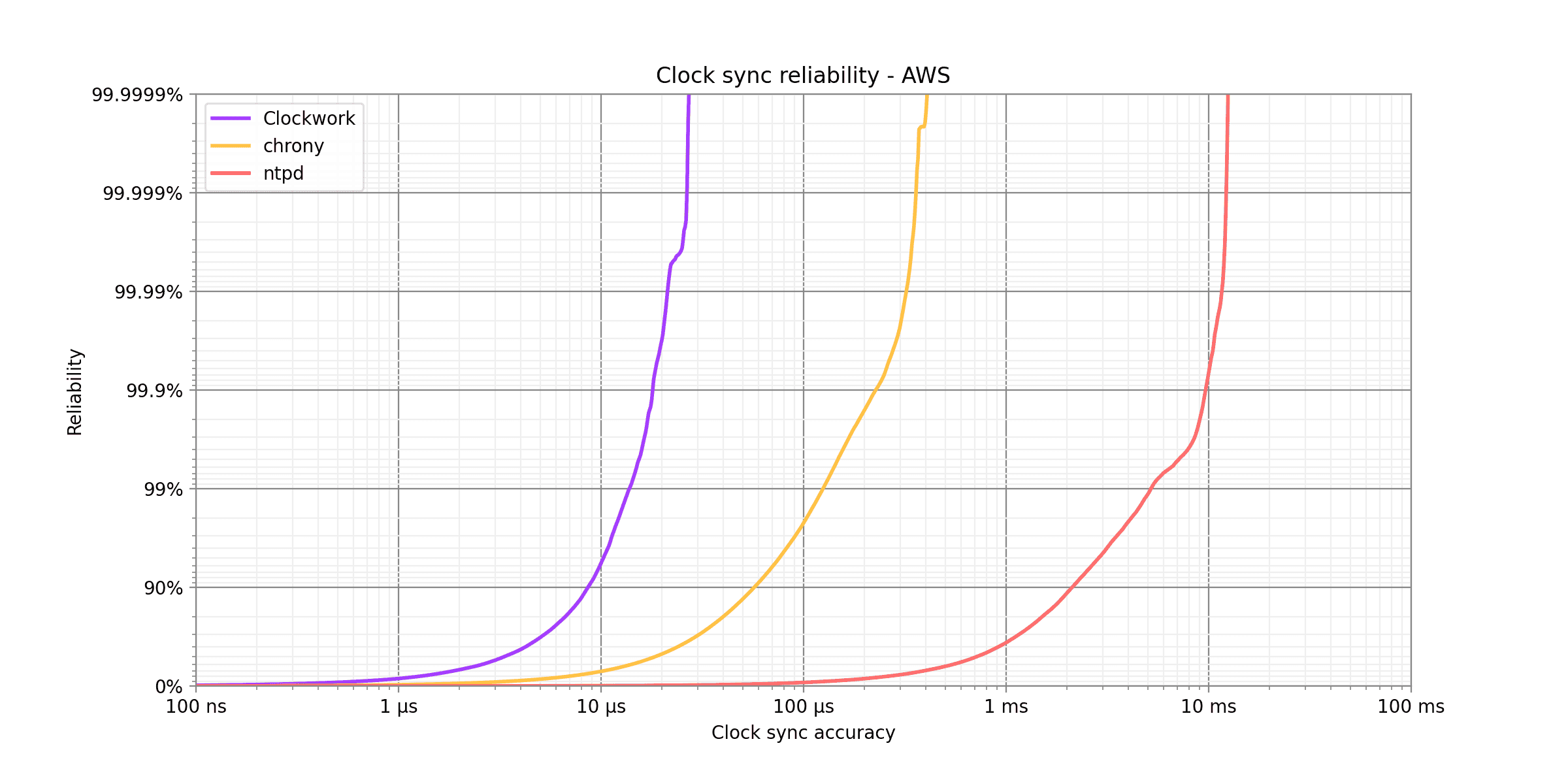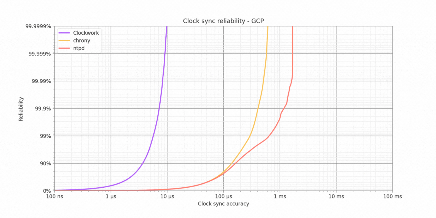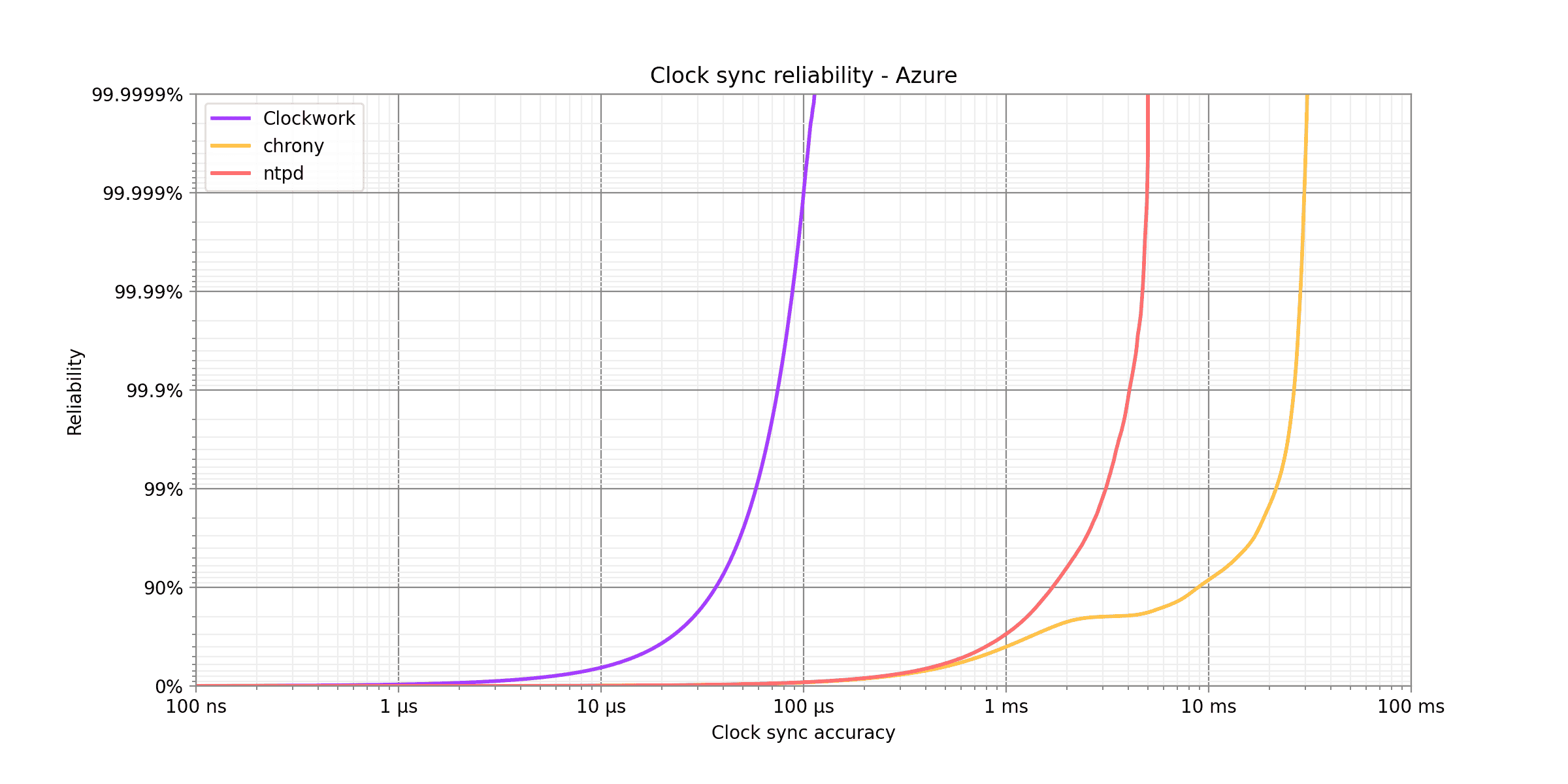 Clockwork’s synchronization outperforms chrony’s by a factor of 52x at 99% reliability (two nines), a factor of 62x at 99.99% probability (four nines), and a factor of 62x at 99.9999% (six nines). It also outperforms ntpd by a factor of 100x or better at all these benchmark points.