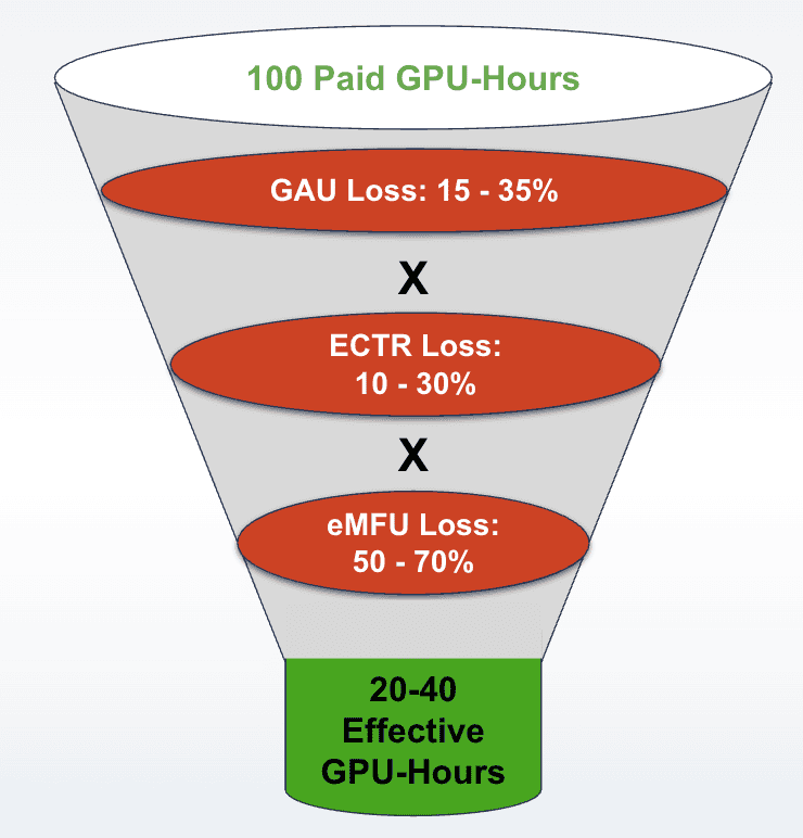 GPU Allocation Utilization (GAU) measures whether the carpenter showed up. Effective Compute Time Ratio (ECTR) measures how much of those eight hours the carpenter actually spent swinging a hammer versus waiting for lumber deliveries or searching for tools. And Effective Model Flops Utilization (eMFU) measures how much of that hammering actually turned into finished cabinetry. Even when the hammer is swinging, the carpenter might be driving nails into plywood – using a fraction of their true craftsmanship. Worse, if a wall collapses overnight, they may have to spend two hours on Monday morning rebuilding what they’d already finished Friday.
