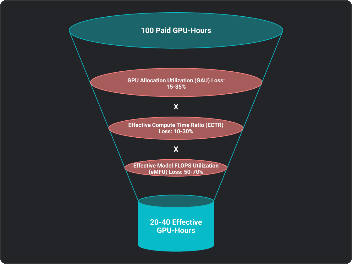 Across the industry, organizations typically convert only 20–25% of paid GPU capacity into useful work. To understand why, you must dismantle the monolithic idea of “utilization” and rebuild it as three distinct layers, each mapping to a different team, a different set of levers, and a different part of the budget that is silently draining away.