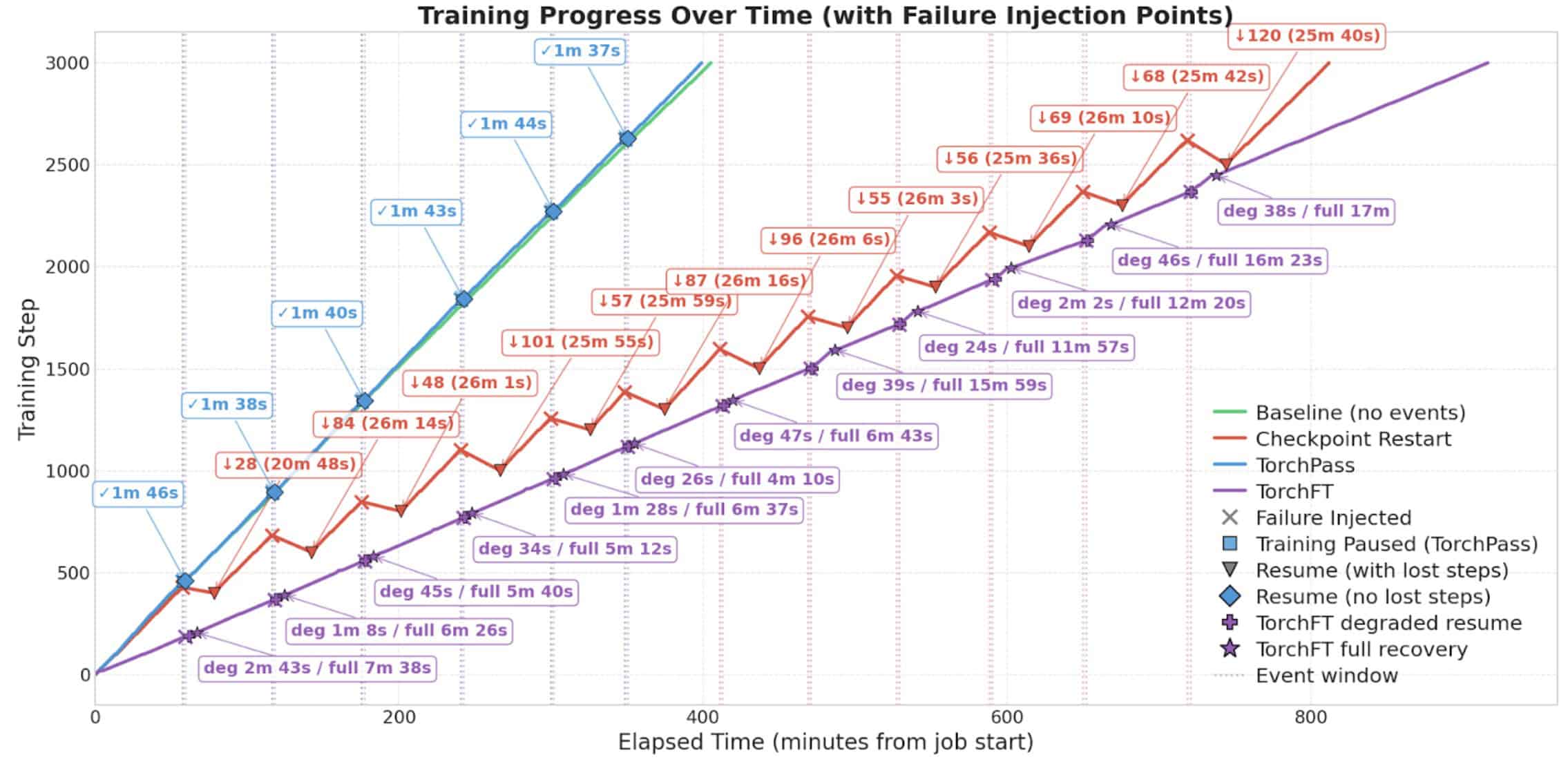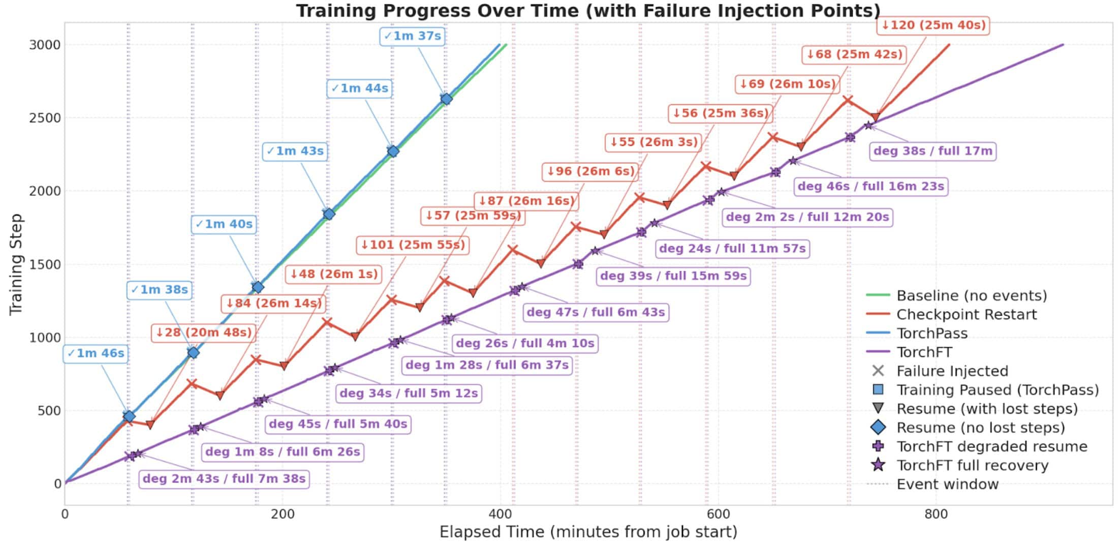 As shown in the table below, the baseline training completed 3,000 steps in 411.3 minutes. TorchPass was 6.7 mins faster, checkpoint restart was 817.5 minutes slower and TorchFT was 903 minutes slower.