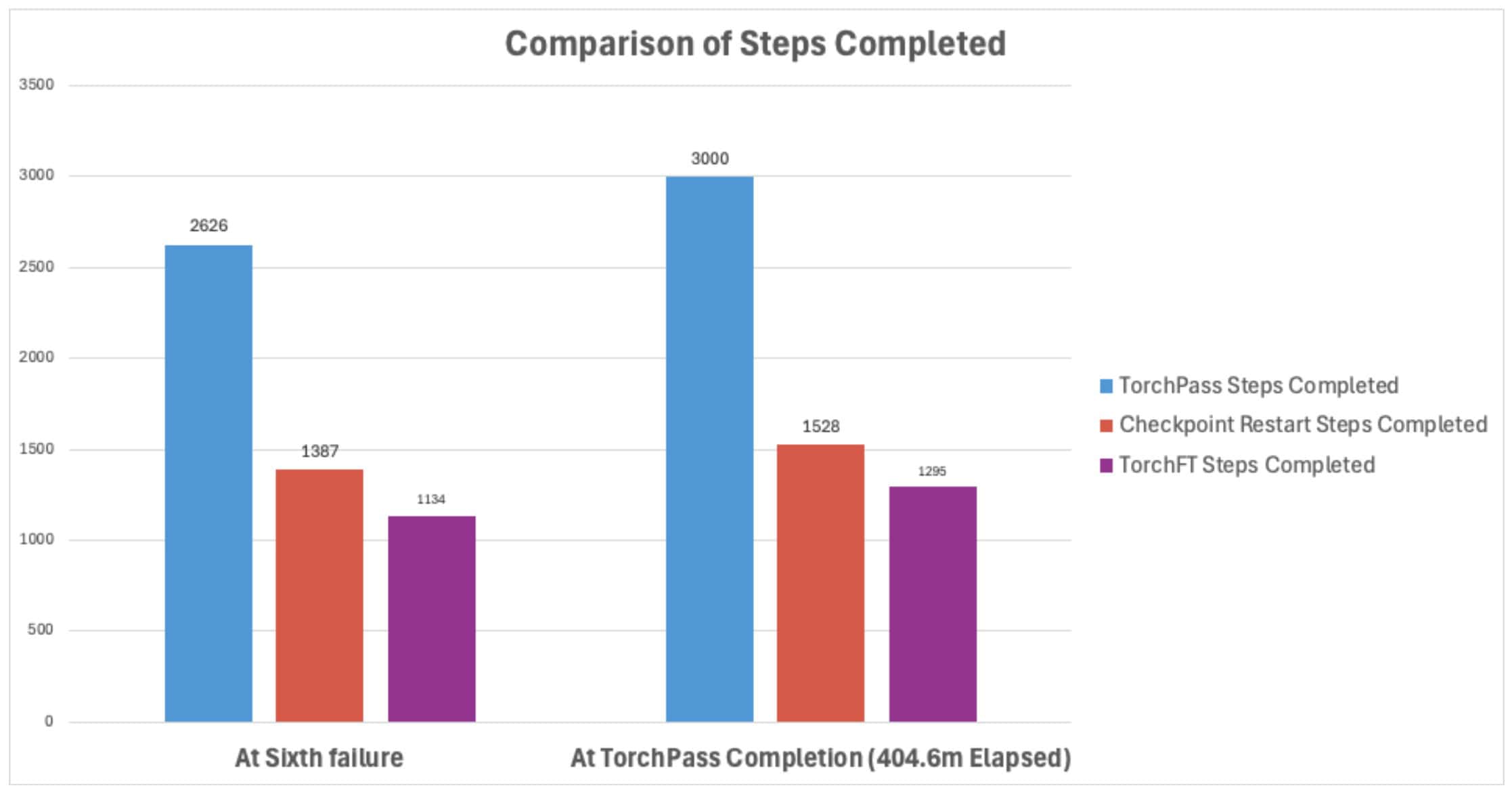 In order to provide an apples-to-apples comparison, the chart and tables below show a comparison of training steps completed at the sixth failure (just prior to TorchPass completion) and at the time that TorchPass completed the test.