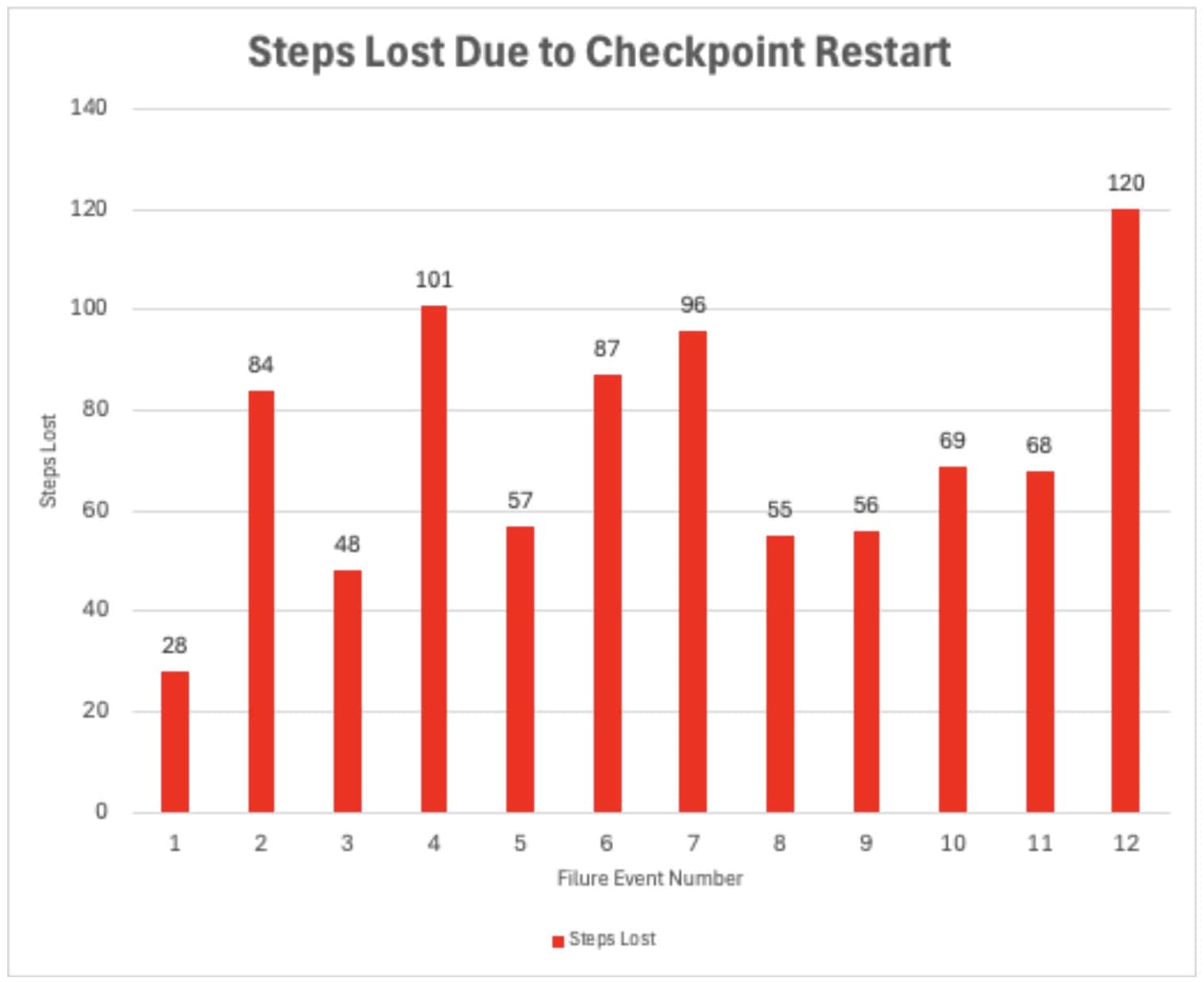 A total of 869 steps were lost and needed to be recomputed during the checkpoint restart test as shown in the chart below. The variance for each failure is due to the random interval timing of the failure injections.